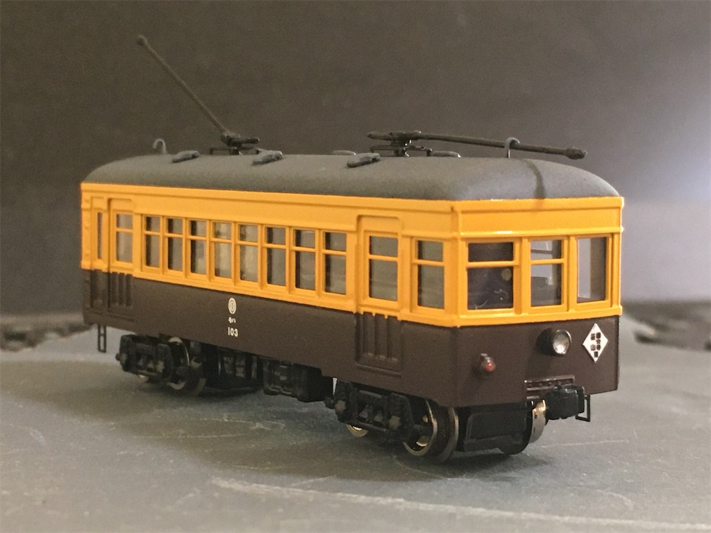 西武多摩湖線初代モハ101形(ポール時代) 2026/1/5公開 ジャンクで入手したkitcheNのクハ1112タイプ から製作。屋根の穴を埋めポールをのせました。 久しぶりの黄茶電ですが1952年頃ということで 色味を変えてみました。まえに作ったクハ1101と ようやく編成が組めます。 2段に下がった裾とおへそライトが野暮ったくて かわいいです。 |